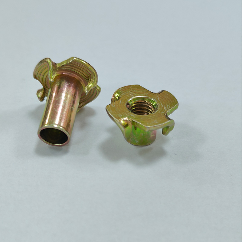 Four-claw tee nuts, also known as four-prong tee nuts, are fasteners commonly used to provide a threaded socket in wood, particle board, and other composite materials. These nuts are typically made of metal such as steel or brass and have a cylindrical shape with internal threads and a flange at one end. The flange has four protruding prongs or claws that help secure the nut into the material.